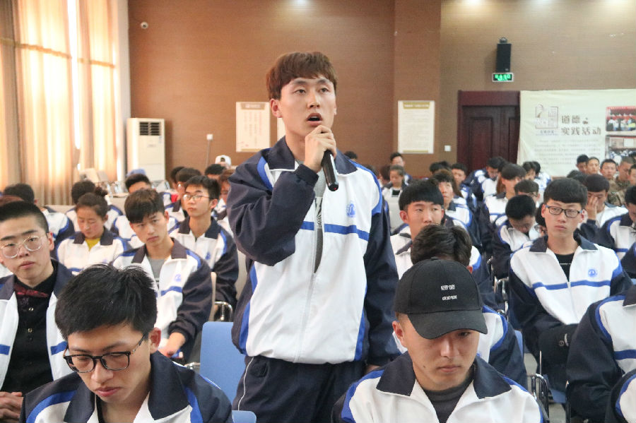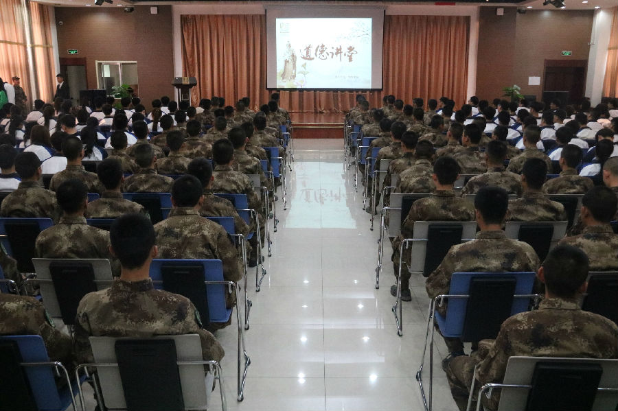 活动伊始,随着一声嘹亮的“起立”,参会的全体师生在士官班员工的带领下,激情高唱歌曲《走向复兴》,整齐昂扬的歌声为活动拉开了帷幕。本次道德讲堂共分为六个环节,分别是唱歌曲,讲故事,诵经典,学模范,谈感悟,送吉祥。