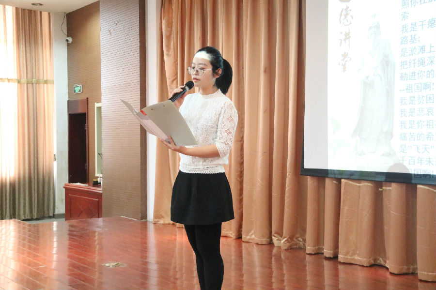 在诵经典环节,辅导员高颖老师为大家带来了舒婷的诗:《祖国啊,我亲爱的祖国》,当优美的音乐响起,同学们心潮澎湃,内心油然而生一种强烈的爱国主义之情。