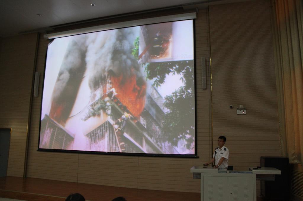 刘教官通过PPT分别从消防安全的重要性、火险分类、针对不同类型的火险如何进行有效的灭火、如何使用消防设施等几个方面进行了生动的讲解。通过一个个触目惊心的案例,大家深切感受到火灾带给人们的危害,沉痛的教训让在场的所有老师同学们深刻地体会到,了解消防安全是多么重要,要认真学习消防安全知识,采取正确的灭火方法,并选用适当的灭火工具积极扑救;及时拨打“119”报警,说清地名及电话号码、燃烧物质与火势大小、人员被控情况等。以及发生火灾时要保持镇静,适当判断危险地点和安全地点,尽快撤离。逃生时不可蜂蛹而出或留恋财物。穿过火区时,应尽量用浸湿的衣物披裹身体、捂住口鼻、贴近地面。最后强调了同学们在公司如何避免引起火灾等。讲解风趣,案例播放生动,会场非常安静有序。