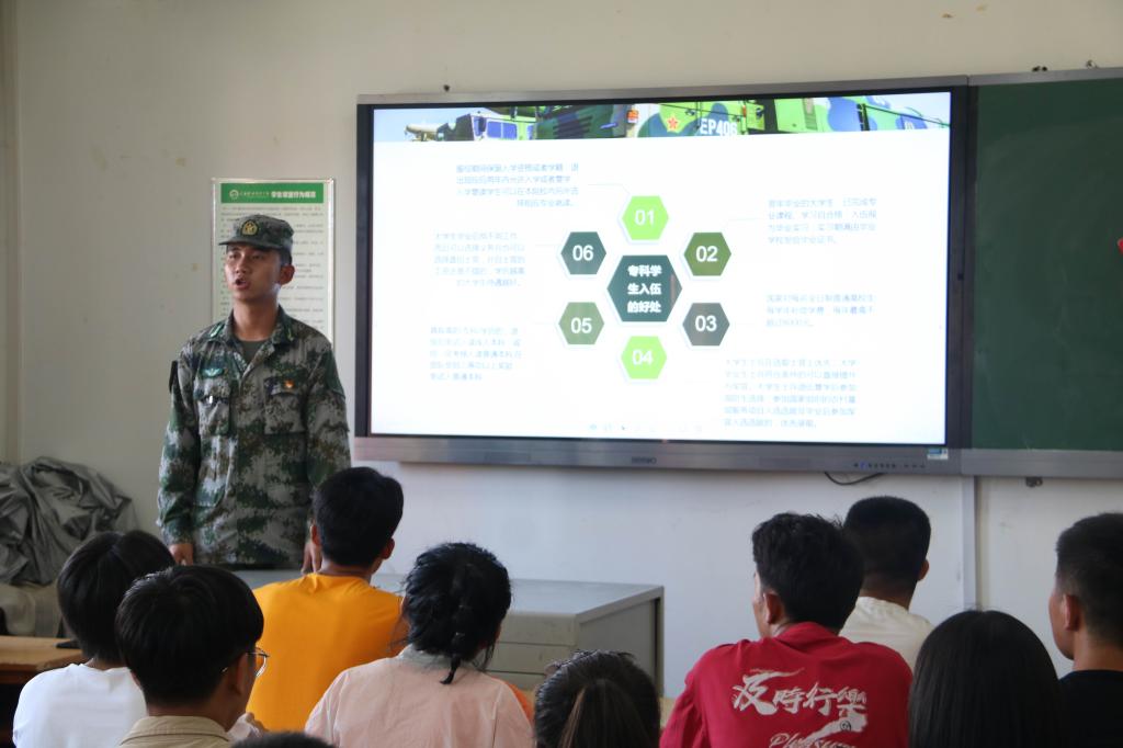 活动中,士官大队总教官马登军向大家分享了自己的军旅成长经历,详细讲解了征兵入伍的流程以及国家对参军入伍老员工的优惠政策,激励同学们携笔从戎。精彩的讲座赢得了同学们的热烈掌声,大家被他的爱国情怀和军人情怀深深感动。最后马教官鼓励同学们,作为新一代老员工,要敢于有梦、敢于追梦、敢于圆梦,积极响应习近平总书记的号召,让青春在军营的历练中、在为祖国的奉献中闪光。