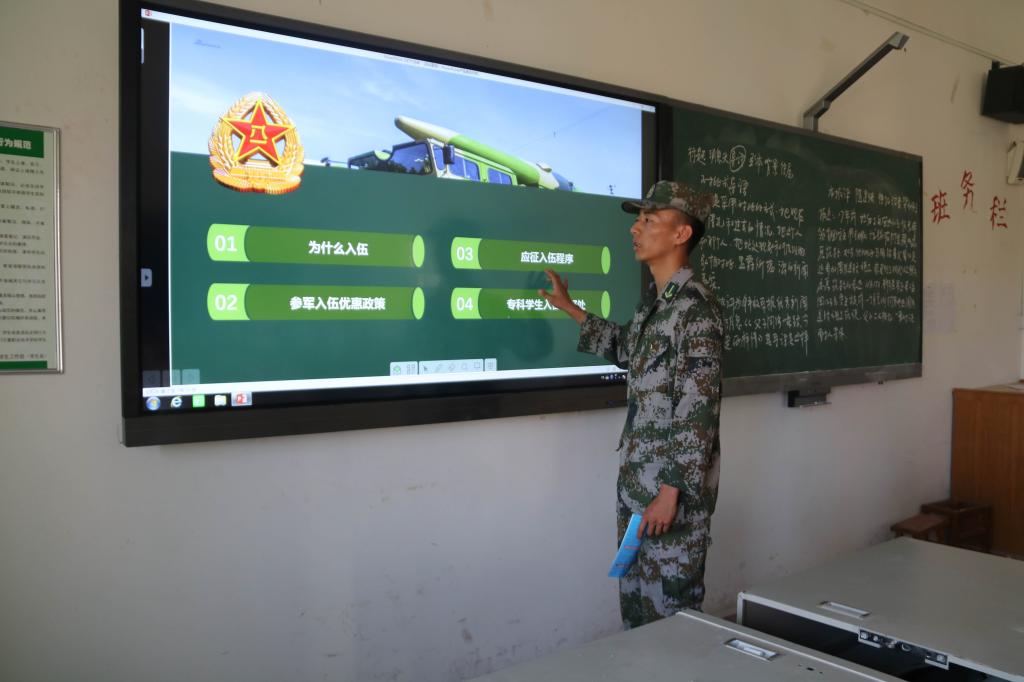 随后,2017级士官班优秀员工代表张梦嘉、金旭辉向同学们讲述了士官大队里的故事。通过PPT向同学们介绍了应征入伍条件、入伍的优惠政策以及未来个人发展的优势。高校毕业生应征入伍服义务兵役,享有优先报名应征、优先体检政审、优先审批定兵、优先安排使用“四个优先”政策和老员工入伍优先选拔使用、学费补偿和国家助学贷款代偿、退役后考学升学优惠、就业服务等政策。