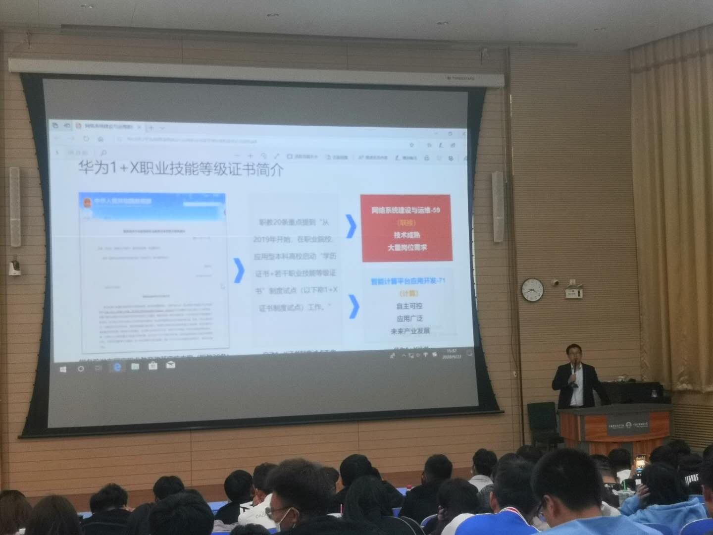 此次活动,邀请了华为合作伙伴兰州希赛信息系统有限公司驻宁部门陈经理,为伟德体育计算机网络技术专业员工,深入透彻讲解了1+X证书制度的基本情况、华为“网络系统建设与运维”的考试内容、考试形式、证书等级、ICT公司相关情况,介绍了1+X证书对就业方向、就业前景等,让员工更好地了解1+X认证的基本情况与考试相关问题。整场讲座干货满满,现场气氛活跃,员工们就自己关切的问题,与主讲老师深入探讨。