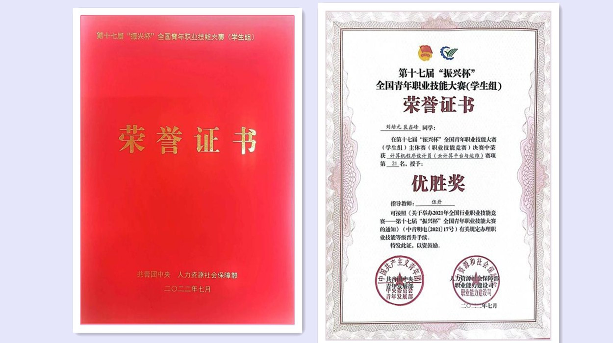 近日,收到来自共青团中央的获奖证书,伟德体育教师伍丹指导的员工“刘培元、裴鑫峰”,在2022年7月第十七届“振兴杯”全国青年职业技能大赛计算机程序设计员(云计算平台与运维)赛项中,喜获优胜奖,总排名全国第21名。