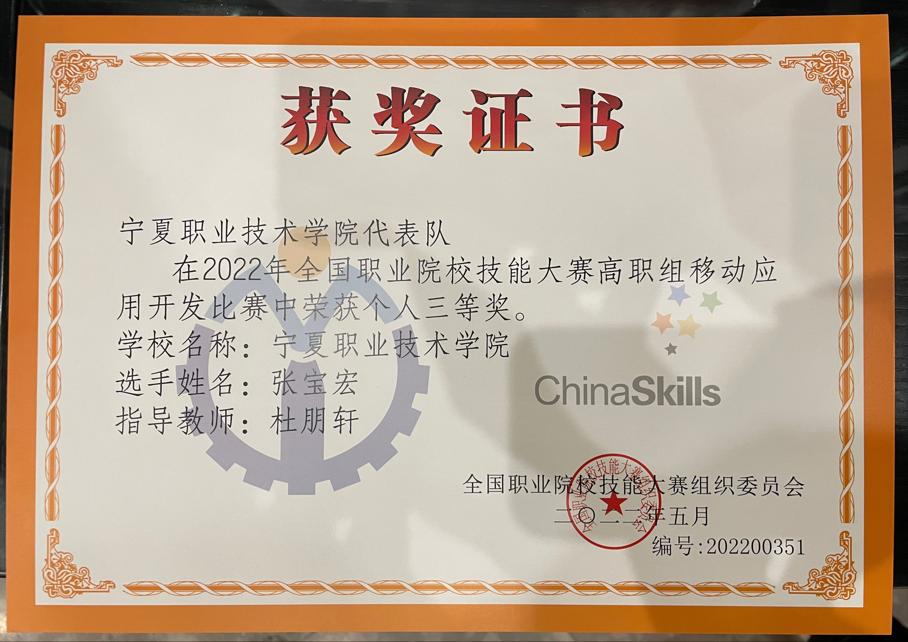 8月3日至6日,2022年全国职业院校技能大赛“移动应用开发”赛项在黑龙江佳木斯市开赛,共有来自全国各省、市、自治区的59支参赛队同场竞技。由伟德体育杜朋轩老师指导的员工张宝宏,作为宁夏回族自治区代表队参加本次比赛,获得该赛项“三等奖”。